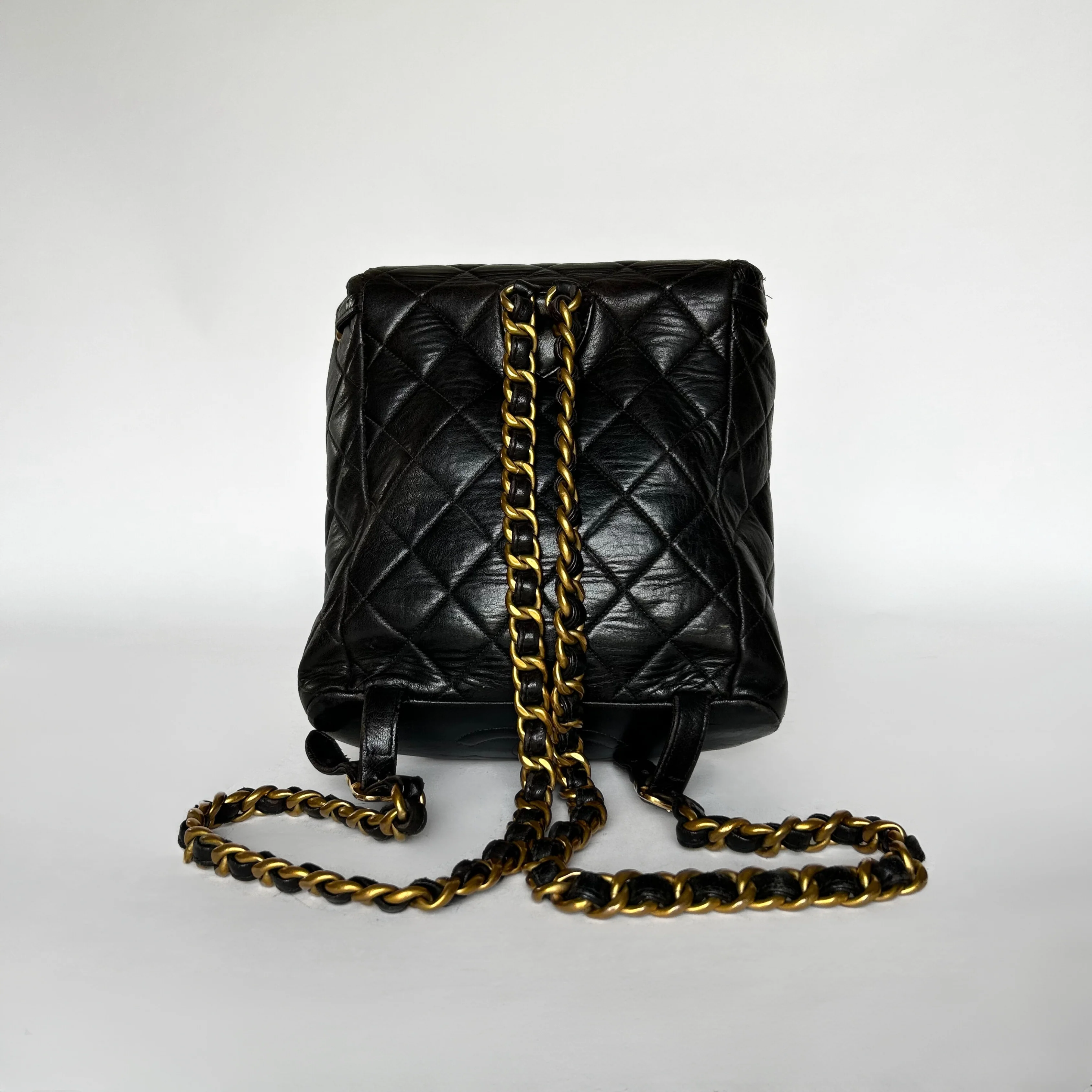 The backpack has gold-plated hardware. This Chanel bag opens with the interlocking CC lock and a drawstring. On the outside of the bag, there is a pocket, which also opens with an interlocking CC lock.