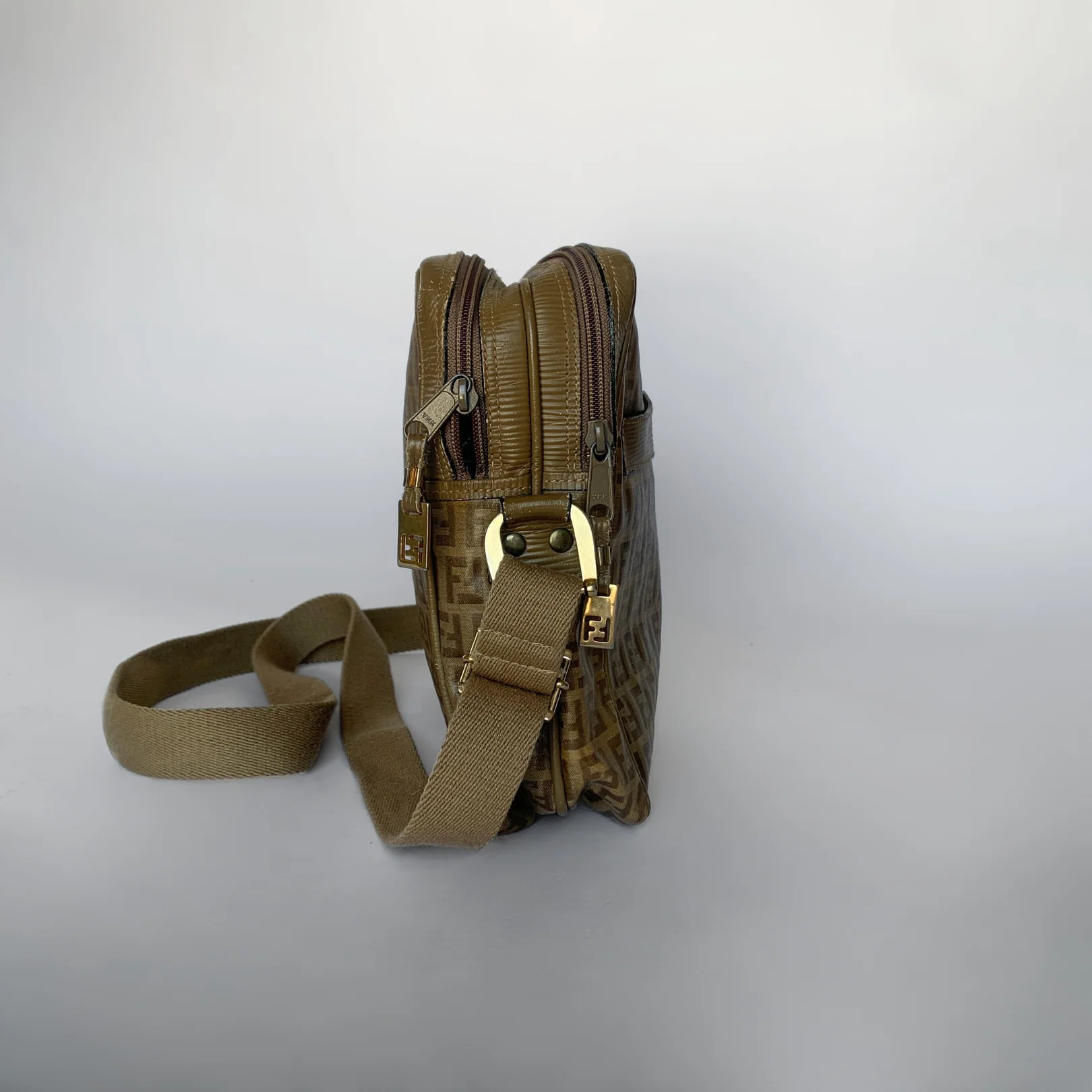 Fendi FF Crossbody Bag in brown, high-quality PVC coating. Complete your look with this crossbody from Fendi. Crafted from Zucca canvas and patent leather, with a leather-lined interior sized to fit your everyday essentials.