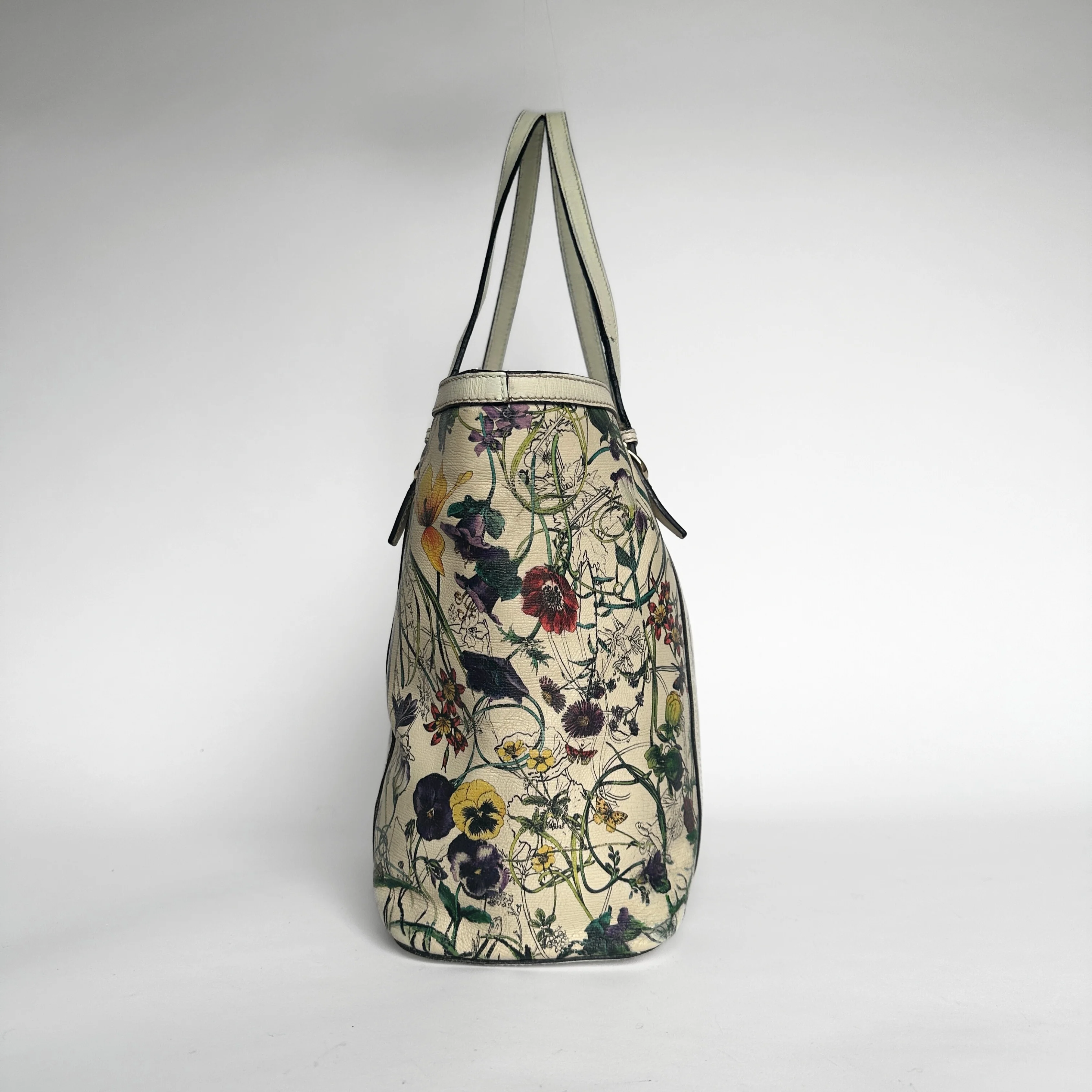The bag is completely printed with the popular Gucci Flora motif. The bag opens without closure and features one main compartment. The inside consists of one zipper pocket and two narrow slip-in pockets. The white leather handles make the bag portable on the shoulder.
